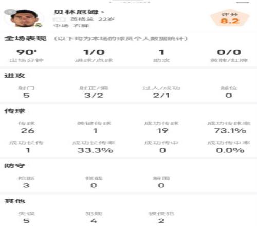 贝林厄姆这场比赛出战90分钟,送出传射建功的好戏,他有着5次打门,其中3次射正2次射偏;贝林厄姆2次尝试过人,其中1次成功。