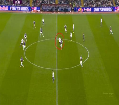 这里都是没问题的,但到了前场,芒特在背身的情况下被奥纳纳顶掉,球权转换,阿斯顿维拉开始向前: