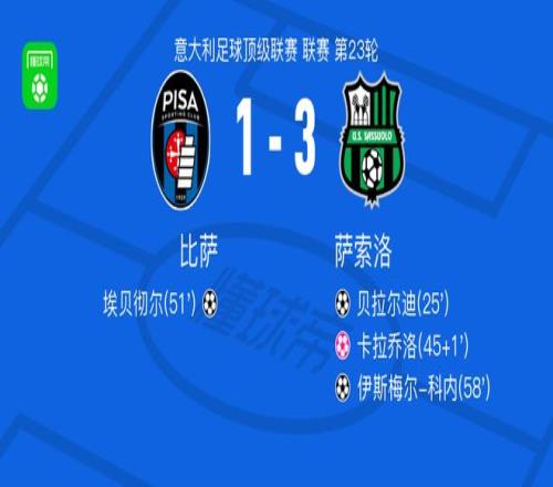 北京时间1月31日意大利足球顶级联赛 联赛 第23轮,比萨主场对阵萨索洛。比萨埃贝彻尔破门,卡拉乔洛自摆乌龙。萨索洛贝拉尔迪破门,伊斯梅尔-科内破门。最终比分比萨 1-3 萨索洛。